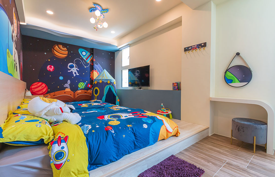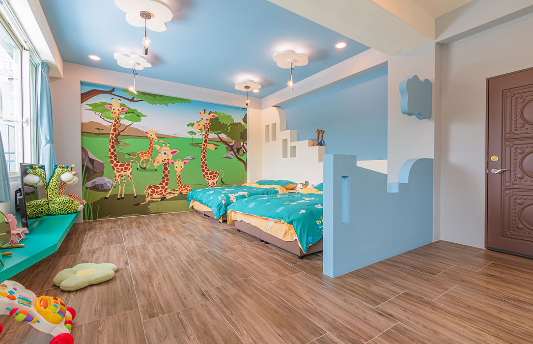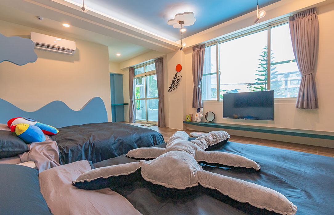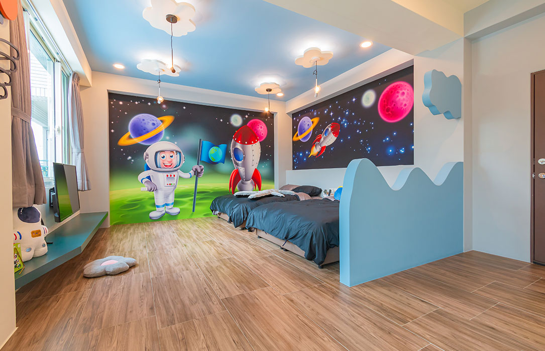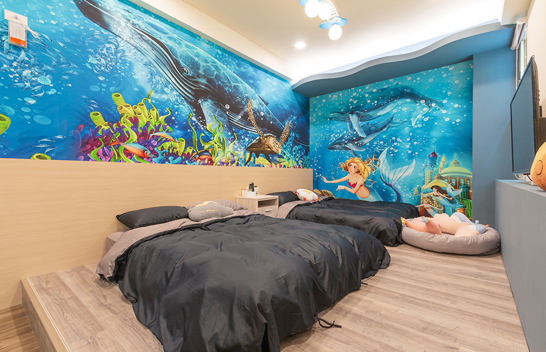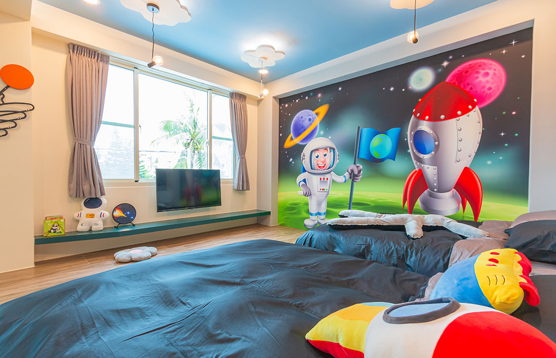房間更有不同主題,小男生最愛的摩特車房、太空人親子房,小女生夢幻的美人魚親子房等,跟著孩子再過一次童年。